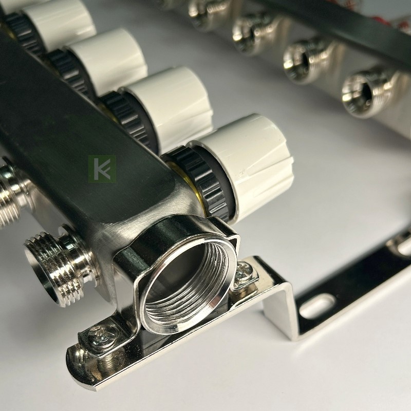 Отводы подающего и обратного трубопроводов – это ниппели с евроконусом и резьбой 3/4”. Коллекторы поставляются без концевых вентилей - они приобретаются отдельно.
