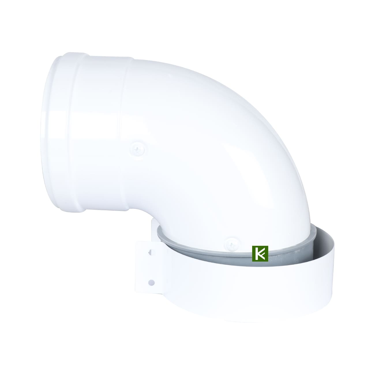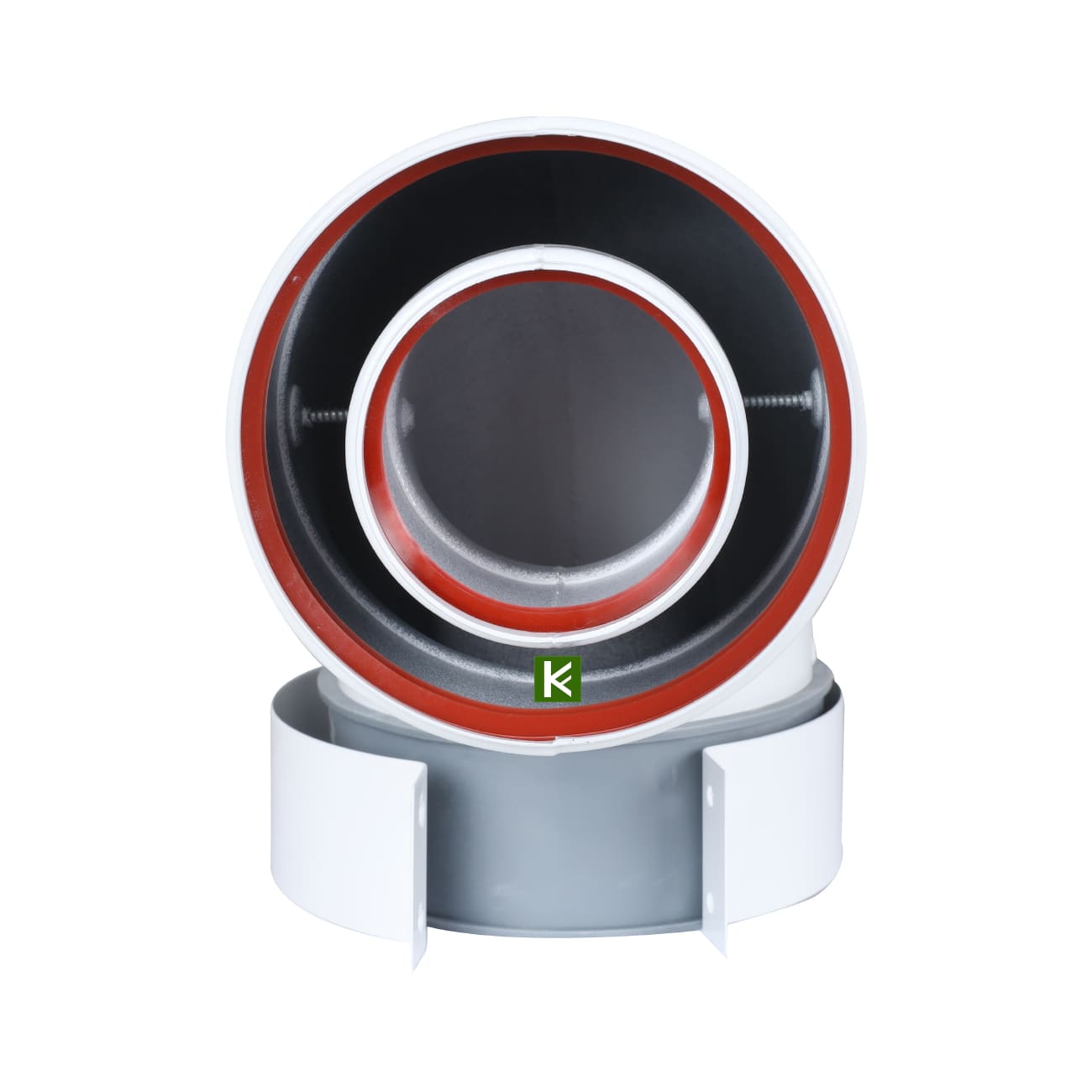 Он имеет угол поворота 90 градусов и диаметр 60/100 мм. Отвод используется на начальном участке системы дымоудаления и поставляется с манжетой для присоединения к выходному патрубку котла.