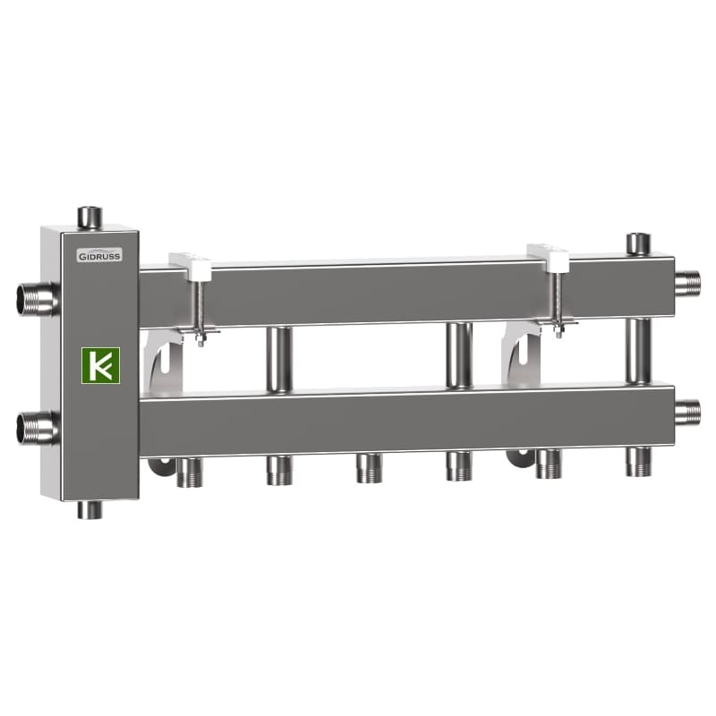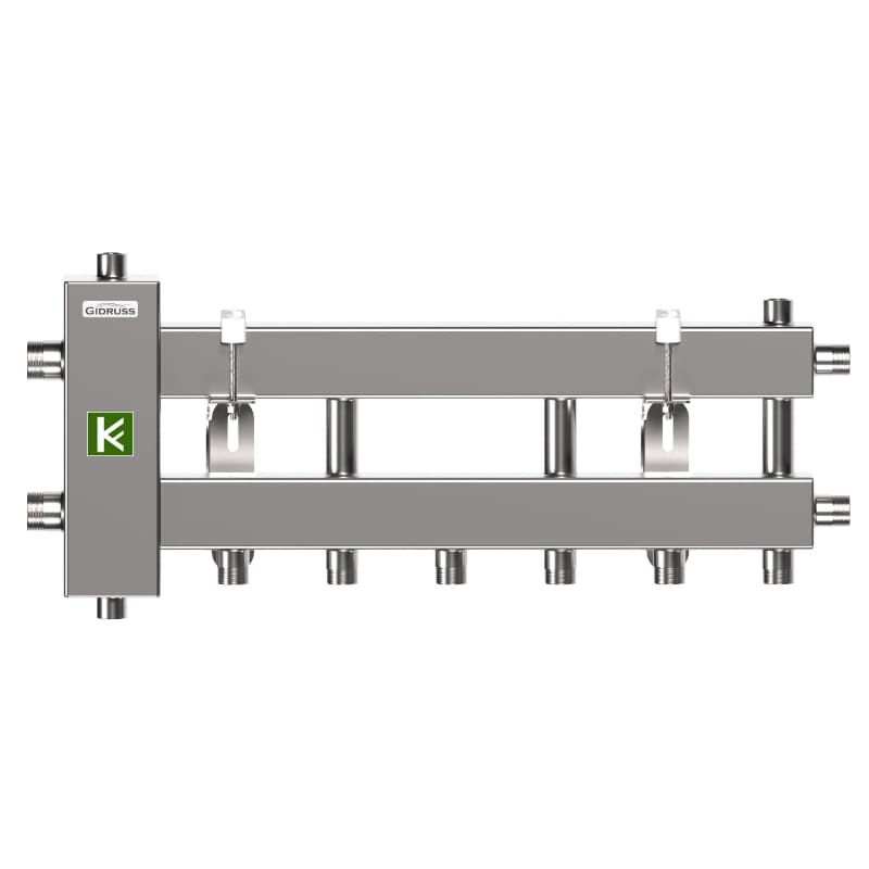 - Распределительные коллекторы (гребенки) Гидрусс для индивидуальных систем отопления имеют встроенный сепаратор, который повышает эффективность удаления воздуха и очищения теплоносителя от механических примесей (шлама).