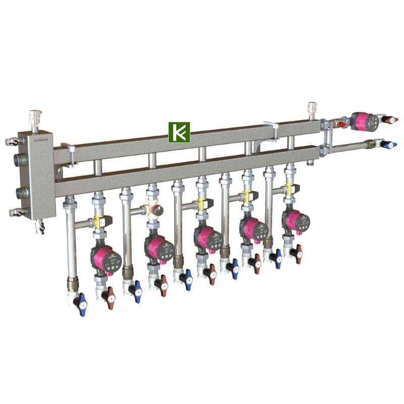 - Контуры G 1'' с межосевым расстоянием 125 мм позволяют устанавливать на коллектор стандартные насосные группы Meibes (группы быстрого монтажа Мейбес) для обвязки котельной.