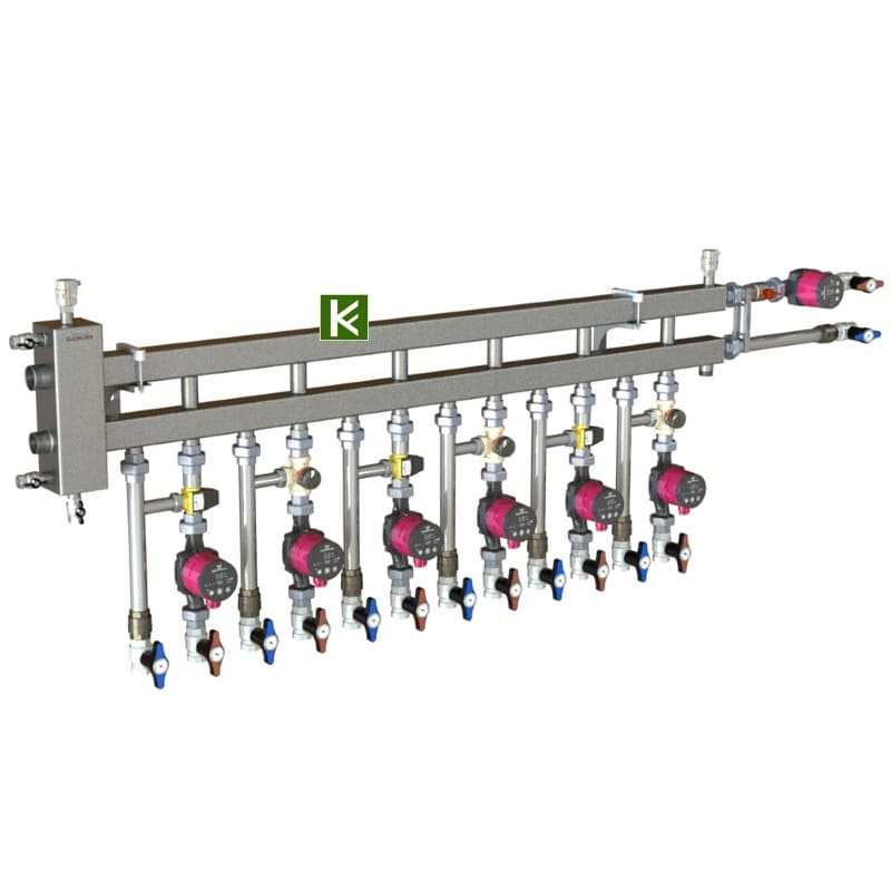- Контуры G 1'' с межосевым расстоянием 125 мм позволяют устанавливать на коллектор стандартные насосные группы Meibes (группы быстрого монтажа Мейбес) для обвязки котельной.