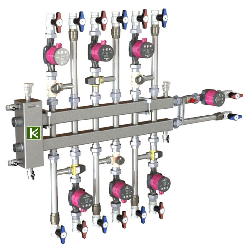 - Контуры G 1'' с межосевым расстоянием 125 мм позволяют устанавливать на коллектор стандартные насосные группы Meibes (группы быстрого монтажа Мейбес) для обвязки котельной.