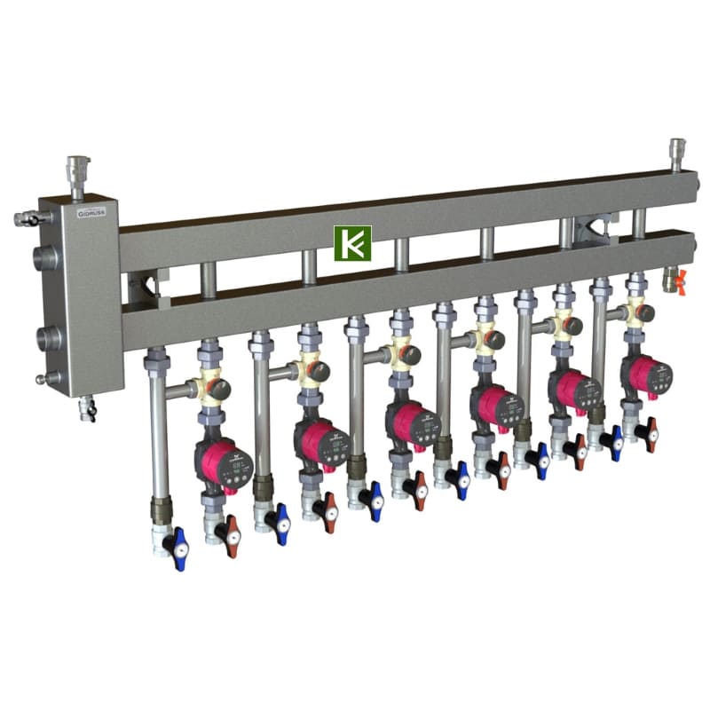 - Контуры G 1'' с межосевым расстоянием 125 мм позволяют устанавливать на коллектор стандартные насосные группы Meibes (группы быстрого монтажа Мейбес) для обвязки котельной.
