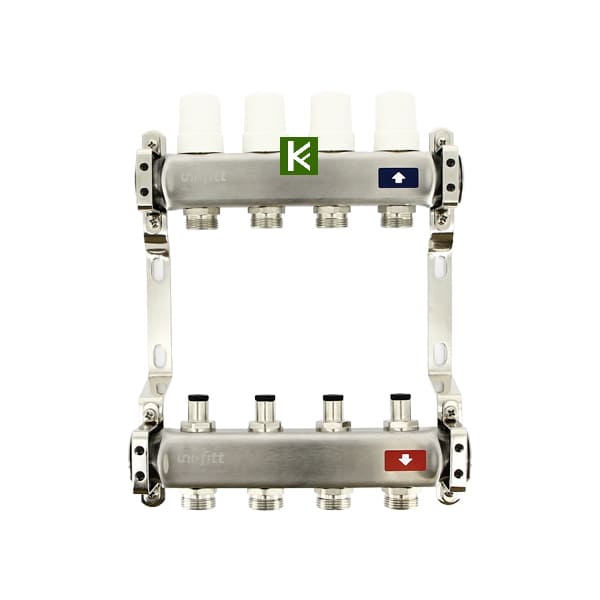 Каждый отвод обратного коллектора снабжён термостатическим вентилем, предназначенным для установки электрического привода или головок для ручной регулировки. Коллекторы поставляются без концевых вентилей - они приобретаются отдельно.