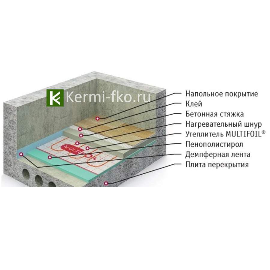 Мультифольга MULTIFOIL - Толщина данного материала 4 мм. Ширина полотна 1,2 м. Рулон — 30 кв.м (25 пог.м) Тепло от нагревательного элемента (водяная труба или электрический кабель) передается бетонной стяжке и далее распространяется наверх за счет теплопроводности бетона.