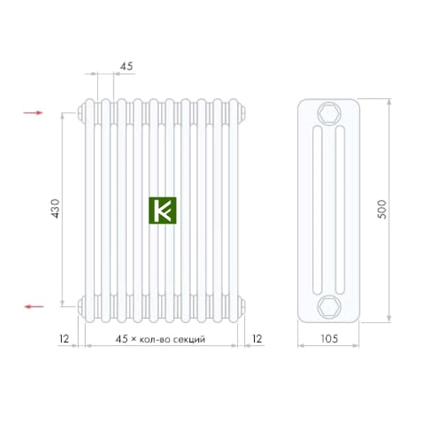 Радиатор отопления Арбония 3050/1 имеет высоту 500 мм, ширину 45 мм, глубину 105 мм, а также стандартное межосевое расстояние 430 мм.