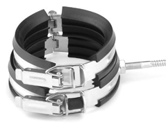 Хомут шумопоглощающий с замковой защелкой состоит из опорного и крепежного хомута с шумопоглощающими вкладышами. Между хомутом и трубой располагается резиновая прокладка, которая гасит вибрации от трубы.