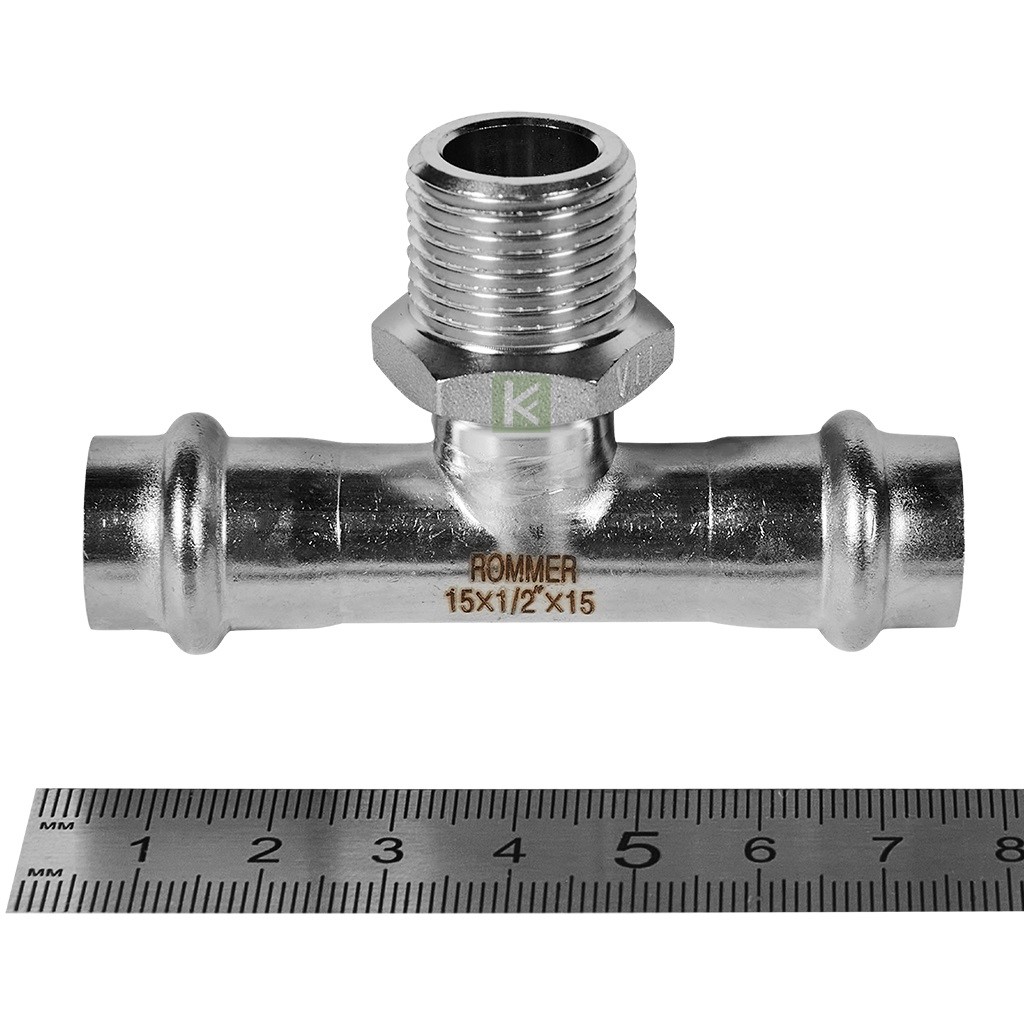 RSS-0016-001512 ROMMER Тройник-переходник 15х1/2 НР, из нержавеющей стали прессовой
