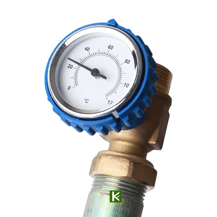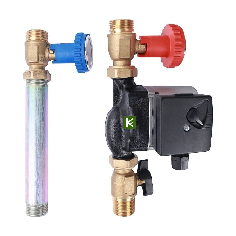 Группа быстрого монтажа Stout оснащена запорными шаровыми кранами, совмещенными со стрелочными термометрами. На возвратной линии шаровой кран совмещен с обратным клапаном.