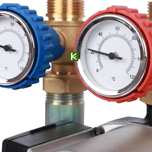 Группа быстрого монтажа Stout оснащена запорными шаровыми кранами, совмещенными со стрелочными термометрами. На возвратной линии шаровой кран совмещен с обратным клапаном.