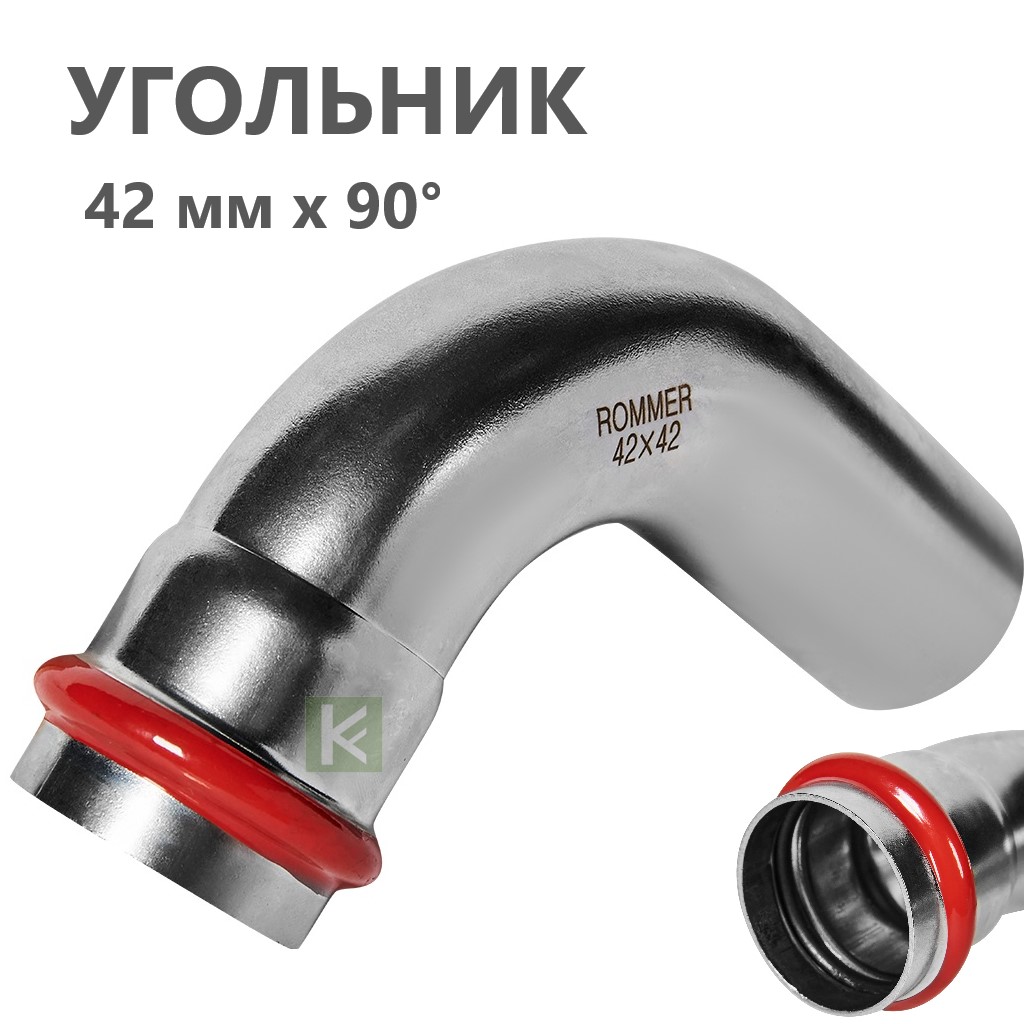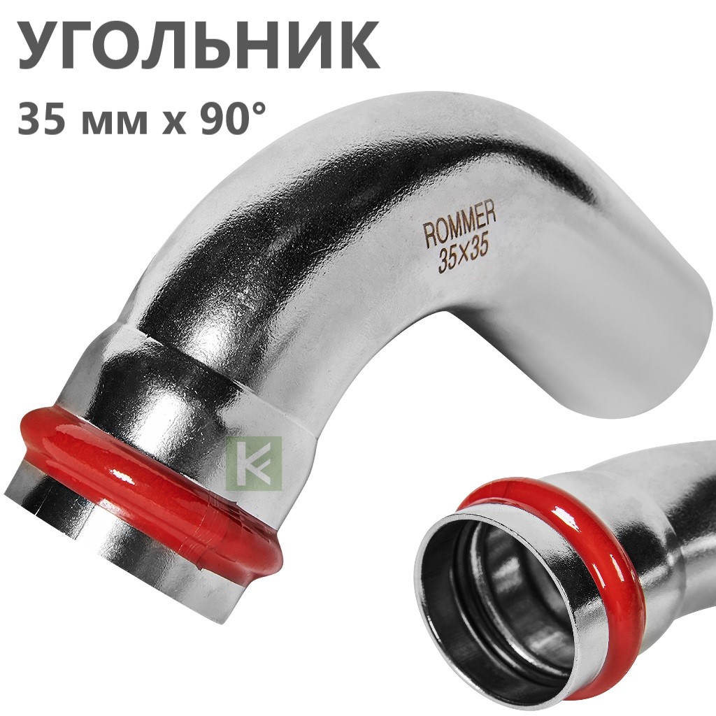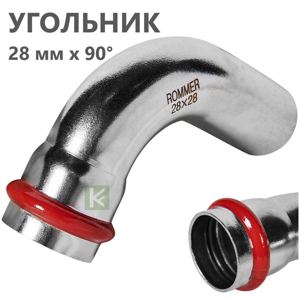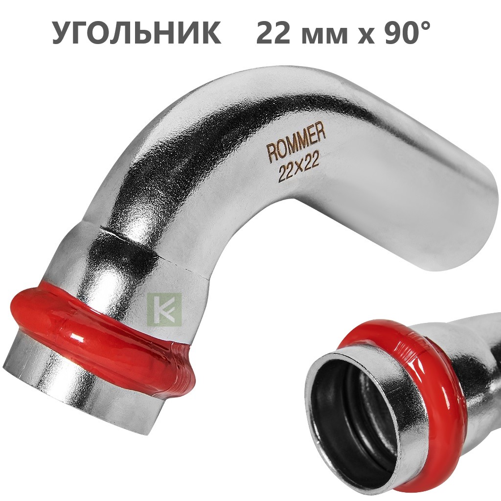 Пресс-углы Rommer RSS-0002 из нержавеющей стали с углом поворота 90° имеют раструб с одной стороны. Толщина стенки составляет 1,5 мм. Пресс-система ROMMER из нержавеющей стали - это высококачественное, устойчивое к коррозии, долговечное и надежное соединение пресс-фитингов и труб, изготовленных из гигиеничной нержавеющей стали SUS 304, способные выдерживать резкие перепады давления. Трубы и фитинги Роммер из нержавейки можно применять в системах с рабочим давлением до 16 атмосфер. Температура рабочей среды (при условии применения с уплотнителями из EPDM) может находиться в диапазоне от -35°C до +110°C. Опрессовка соединений труб и фитингов производится пресс-инструментом с насадками типа «V», имеющих трехточечный профиль обжима.
