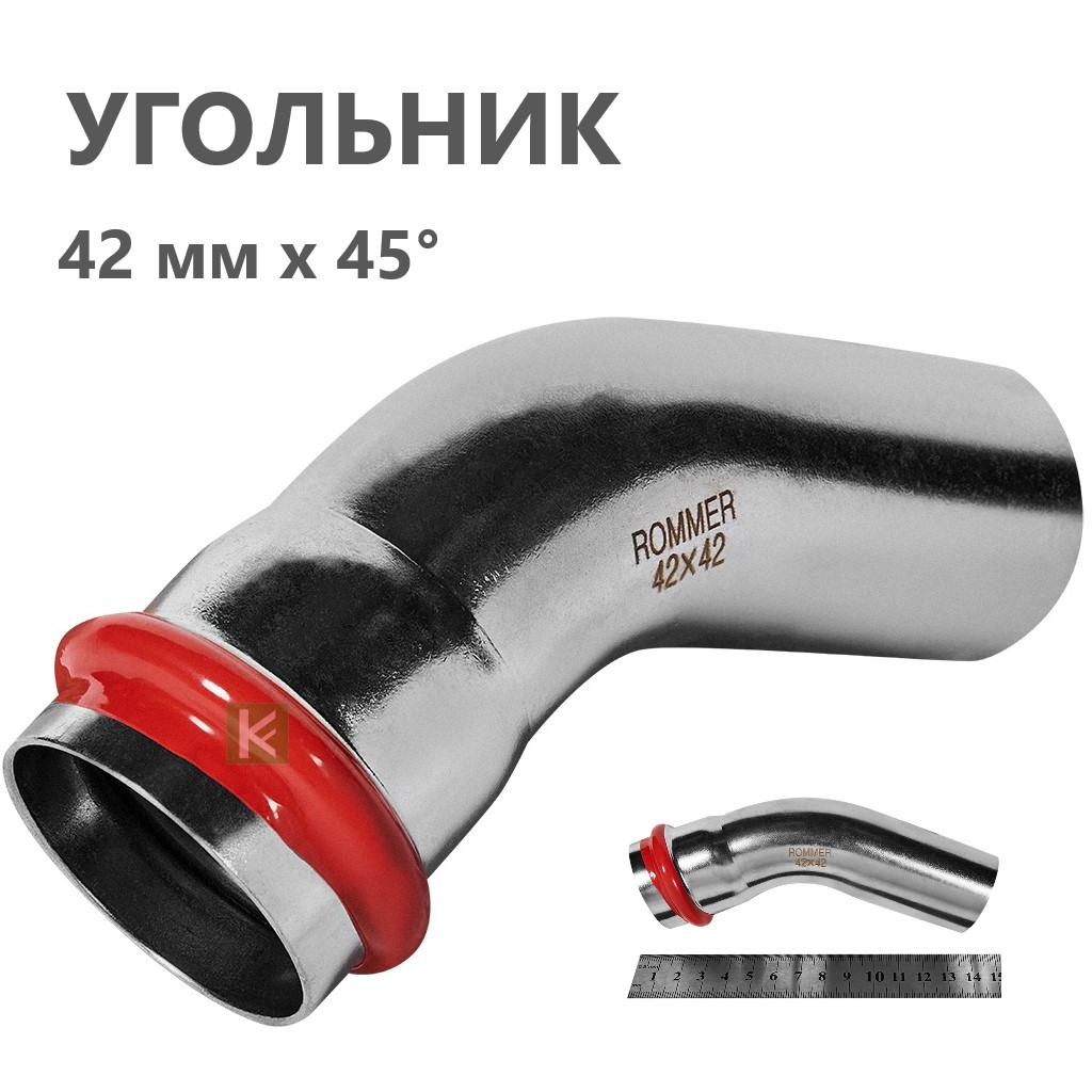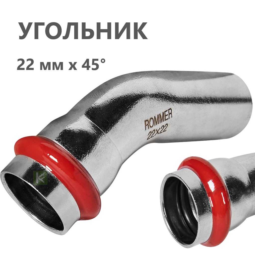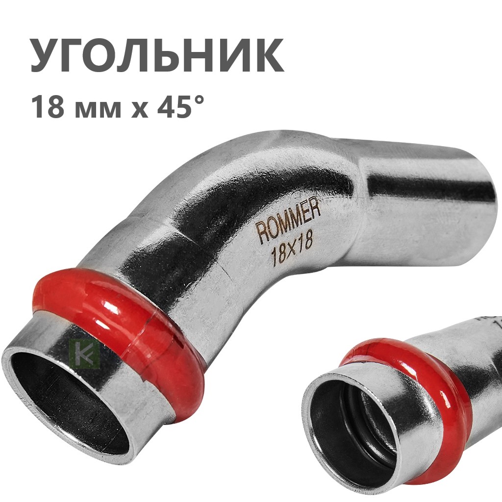 Пресс-углы Rommer RSS-0004 из нержавеющей стали с углом поворота 45° имеют раструб с одной стороны. Толщина стенки составляет 1,5 мм. Пресс-система ROMMER из нержавеющей стали - это высококачественное, устойчивое к коррозии, долговечное и надежное соединение пресс-фитингов и труб, изготовленных из гигиеничной нержавеющей стали SUS 304, способные выдерживать резкие перепады давления. Трубы и фитинги Роммер из нержавейки можно применять в системах с рабочим давлением до 16 атмосфер. Температура рабочей среды (при условии применения с уплотнителями из EPDM) может находиться в диапазоне от -35°C до +110°C. Опрессовка соединений труб и фитингов производится пресс-инструментом с насадками типа «V», имеющих трехточечный профиль обжима.