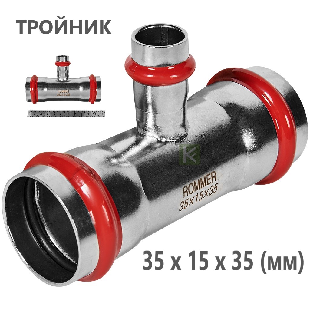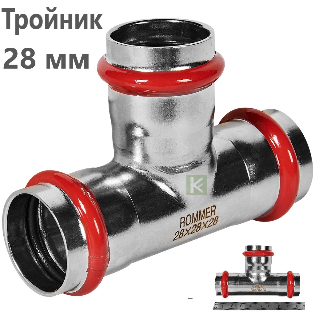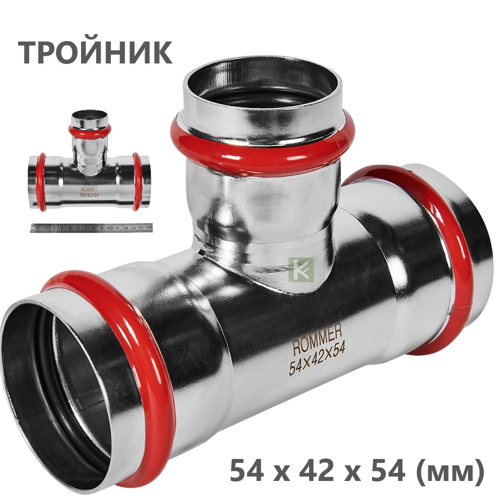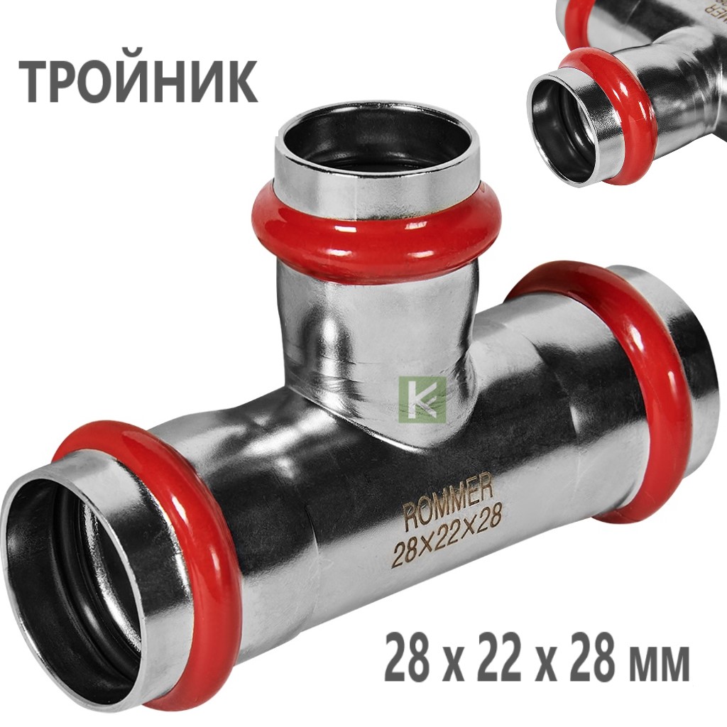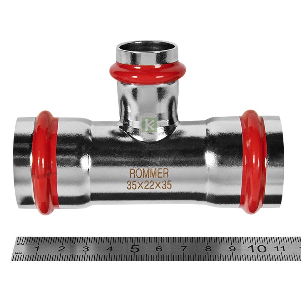 Тройники Rommer RSS-0013 из нержавеющей стали равнопроходные прессовые имеют раструбы одинакового диаметра со всех трёх сторон. Пресс-система ROMMER из нержавеющей стали - это высококачественное, устойчивое к коррозии, долговечное и надежное соединение пресс-фитингов и труб, изготовленных из гигиеничной нержавеющей стали SUS 304, способные выдерживать резкие перепады давления. Трубы и фитинги Роммер из нержавейки можно применять в системах с рабочим давлением до 16 атмосфер. Температура рабочей среды (при условии применения с уплотнителями из EPDM) может находиться в диапазоне от -35°C до +110°C. Опрессовка соединений труб и фитингов производится пресс-инструментом с насадками типа «V», имеющих трехточечный профиль обжима.