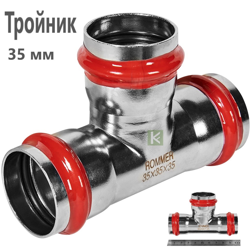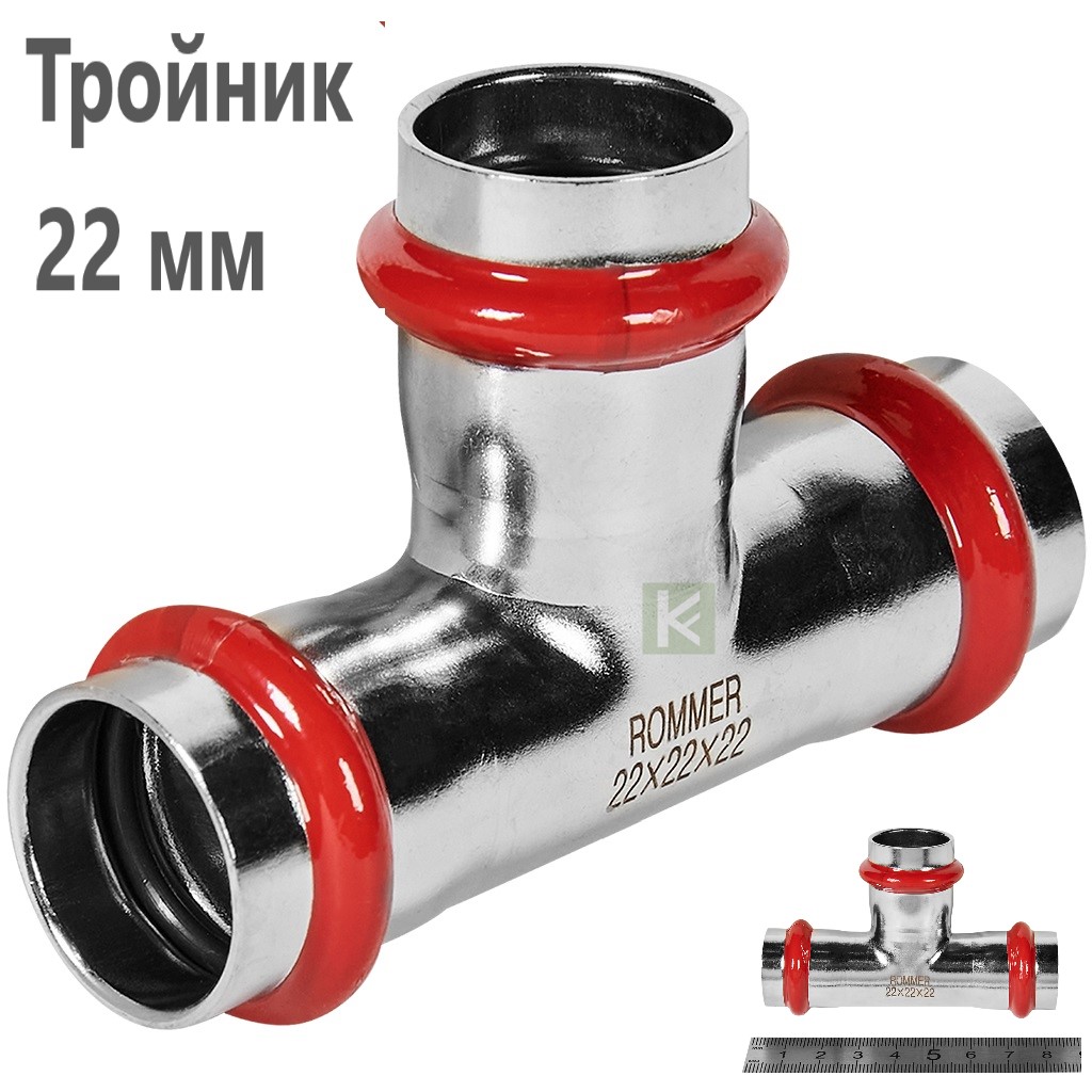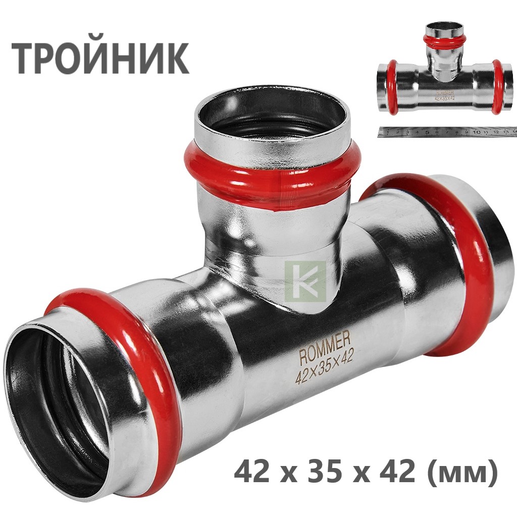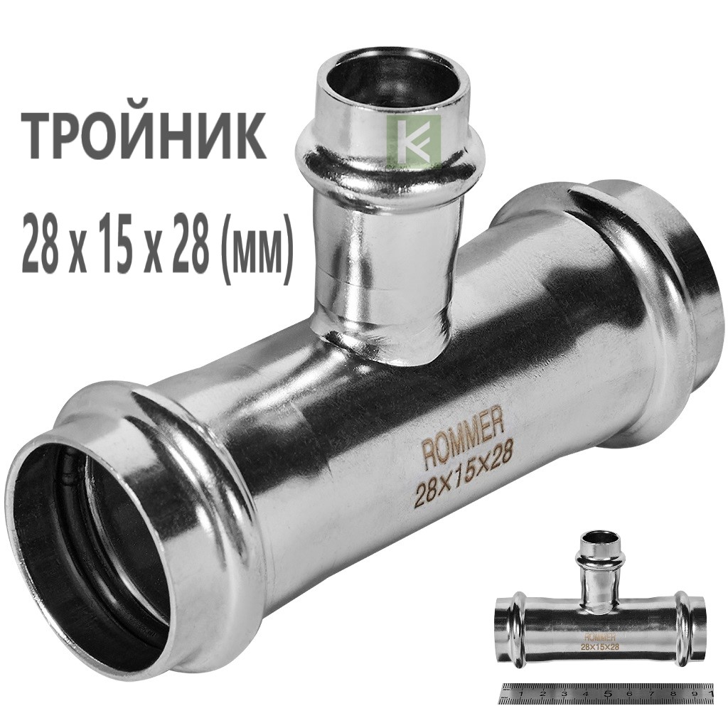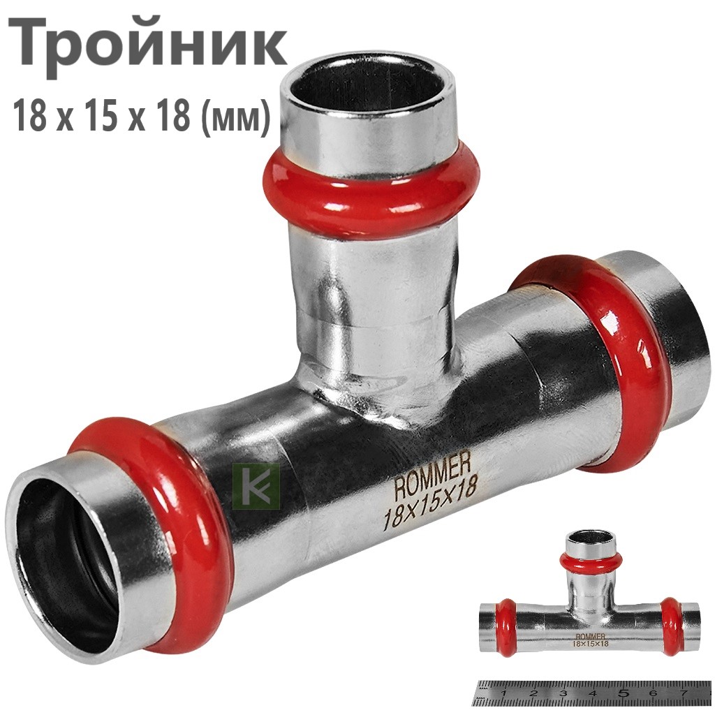 Тройники Rommer RSS-0013 из нержавеющей стали равнопроходные прессовые имеют раструбы одинакового диаметра со всех трёх сторон. Пресс-система ROMMER из нержавеющей стали - это высококачественное, устойчивое к коррозии, долговечное и надежное соединение пресс-фитингов и труб, изготовленных из гигиеничной нержавеющей стали SUS 304, способные выдерживать резкие перепады давления. Трубы и фитинги Роммер из нержавейки можно применять в системах с рабочим давлением до 16 атмосфер. Температура рабочей среды (при условии применения с уплотнителями из EPDM) может находиться в диапазоне от -35°C до +110°C. Опрессовка соединений труб и фитингов производится пресс-инструментом с насадками типа «V», имеющих трехточечный профиль обжима.