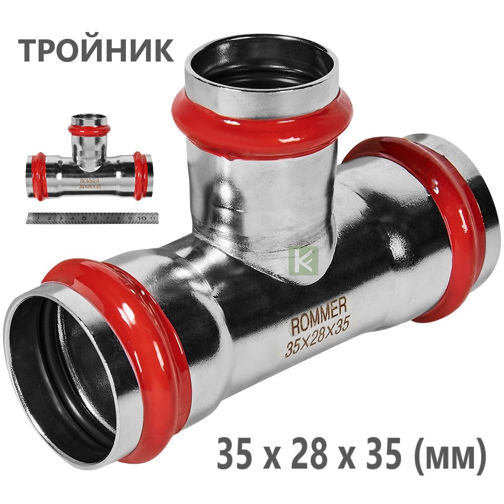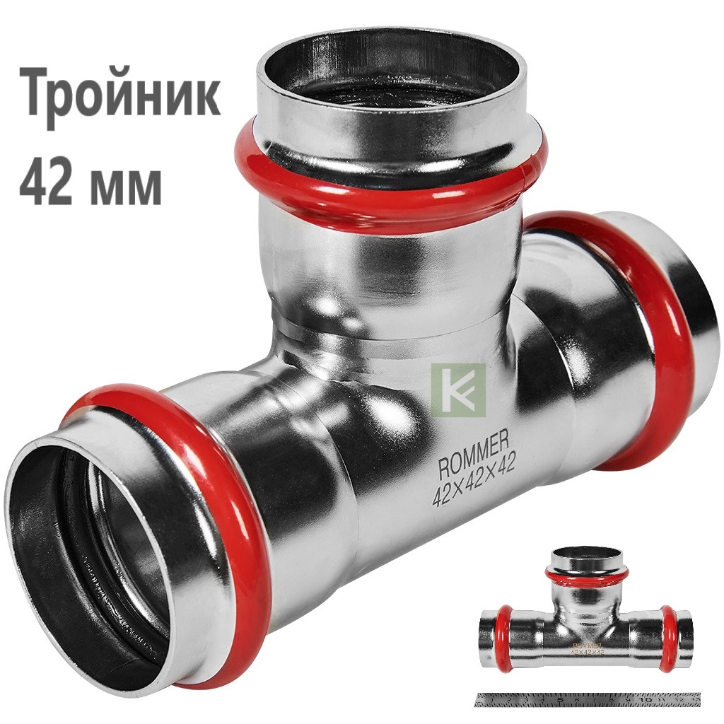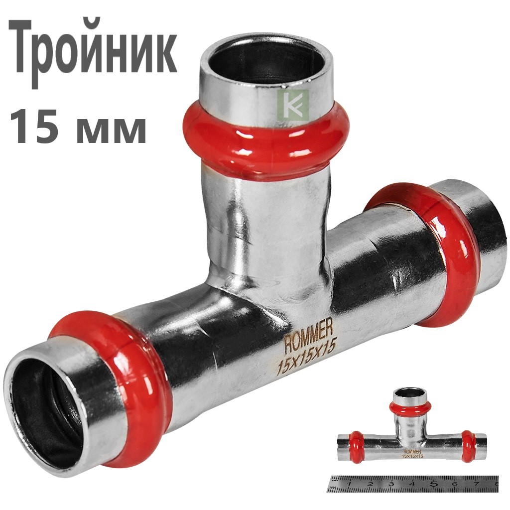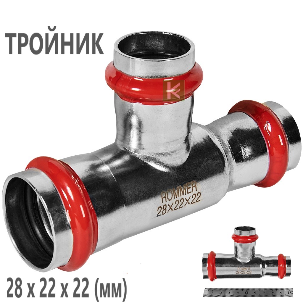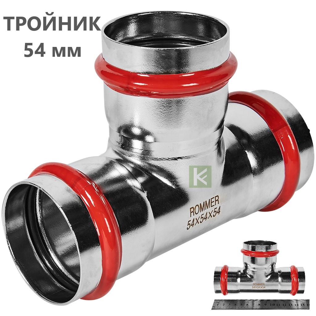 Тройники Rommer RSS-0013 из нержавеющей стали равнопроходные прессовые имеют раструбы одинакового диаметра со всех трёх сторон. Пресс-система ROMMER из нержавеющей стали - это высококачественное, устойчивое к коррозии, долговечное и надежное соединение пресс-фитингов и труб, изготовленных из гигиеничной нержавеющей стали SUS 304, способные выдерживать резкие перепады давления. Трубы и фитинги Роммер из нержавейки можно применять в системах с рабочим давлением до 16 атмосфер. Температура рабочей среды (при условии применения с уплотнителями из EPDM) может находиться в диапазоне от -35°C до +110°C. Опрессовка соединений труб и фитингов производится пресс-инструментом с насадками типа «V», имеющих трехточечный профиль обжима.
