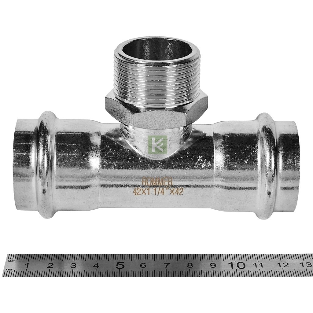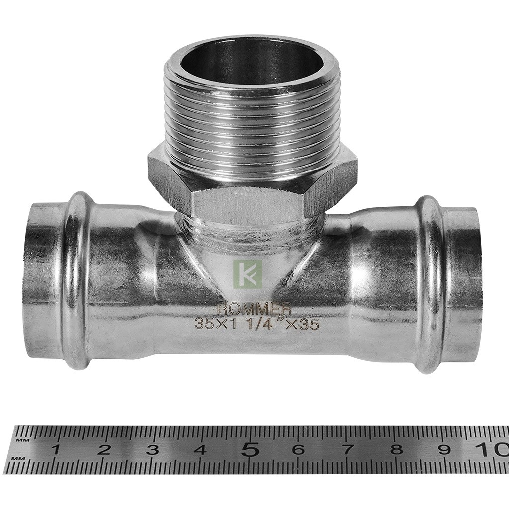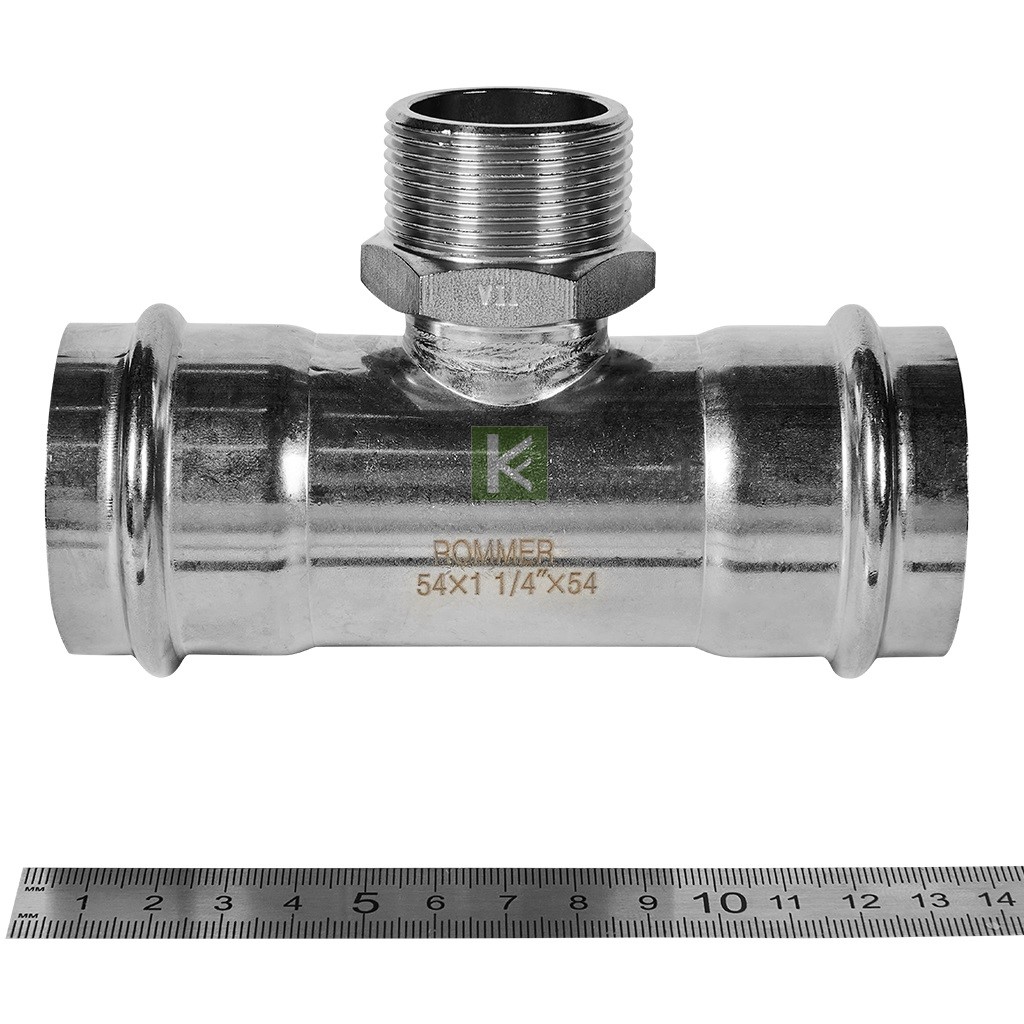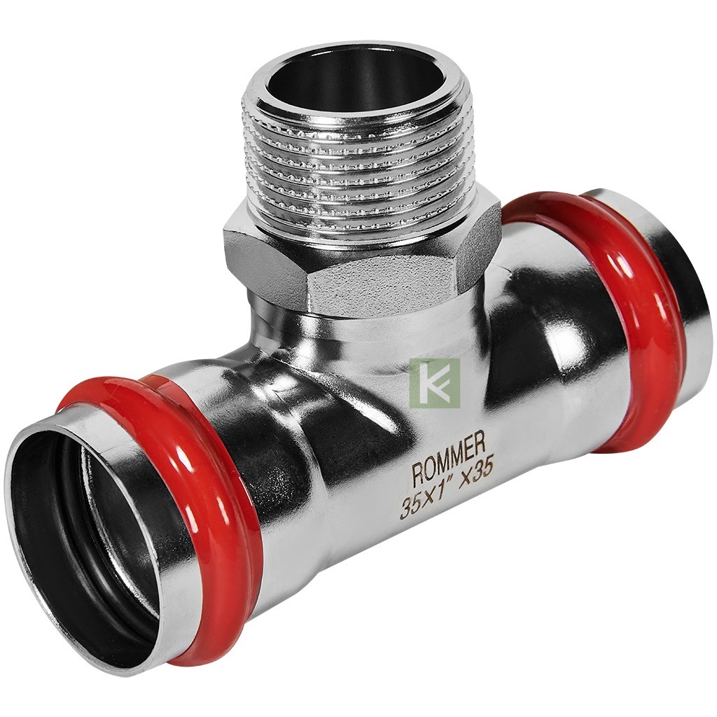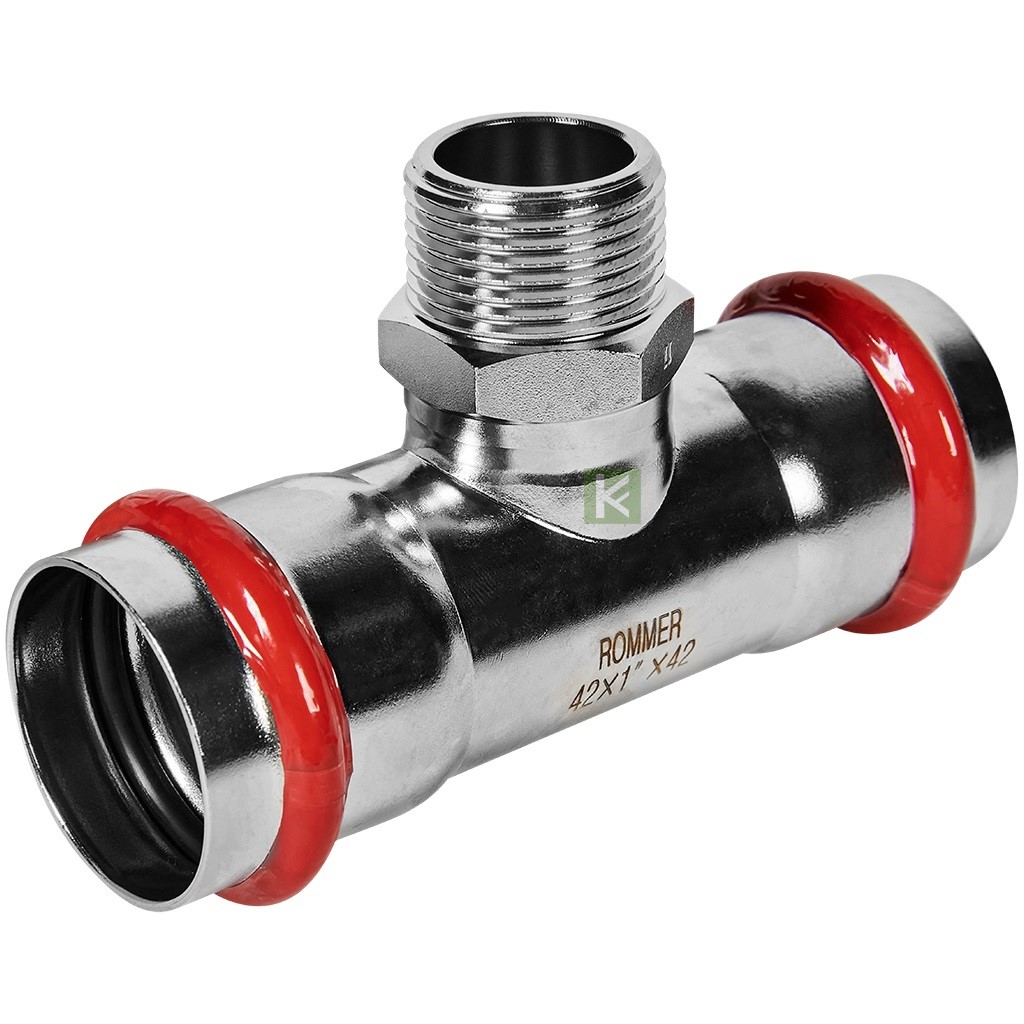 Пресс-тройники НР Rommer RSS-0016 из нержавеющей стали имеют раструбы по бокам, а в центре оборудованы наружной резьбой. Пресс-система ROMMER из нержавеющей стали - это высококачественное, устойчивое к коррозии, долговечное и надежное соединение пресс-фитингов и труб, изготовленных из гигиеничной нержавеющей стали SUS 304, способные выдерживать резкие перепады давления. Трубы и фитинги Роммер из нержавейки можно применять в системах с рабочим давлением до 16 атмосфер. Температура рабочей среды (при условии применения с уплотнителями из EPDM) может находиться в диапазоне от -35°C до +110°C. Опрессовка соединений труб и фитингов производится пресс-инструментом с насадками типа «V», имеющих трехточечный профиль обжима.