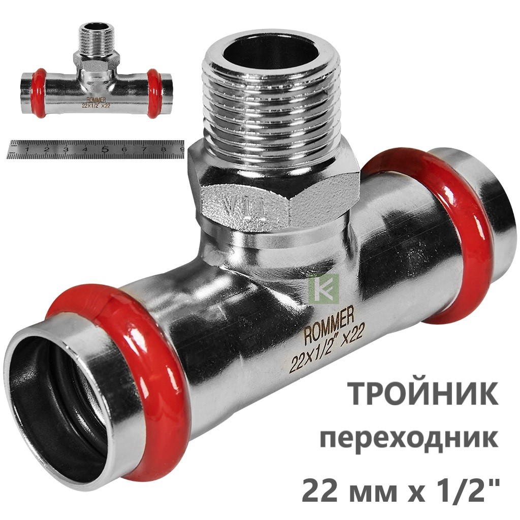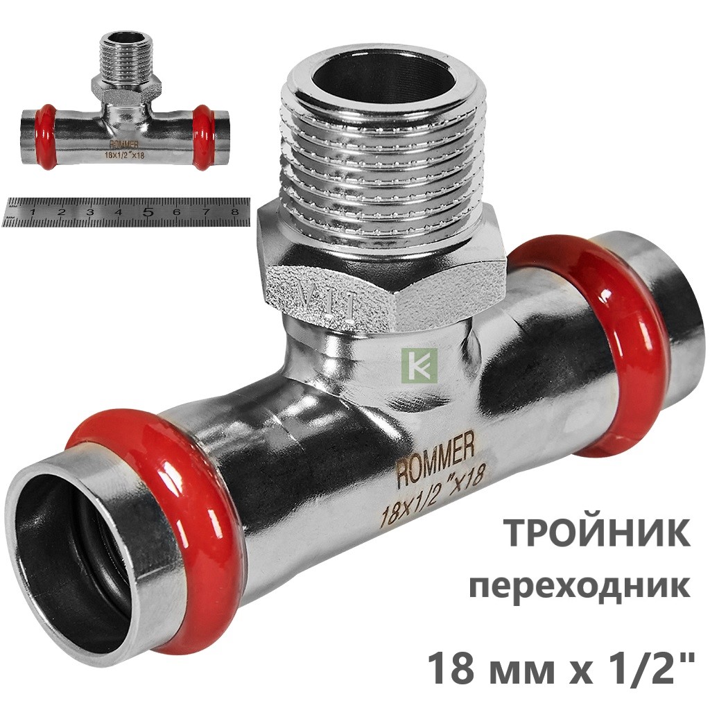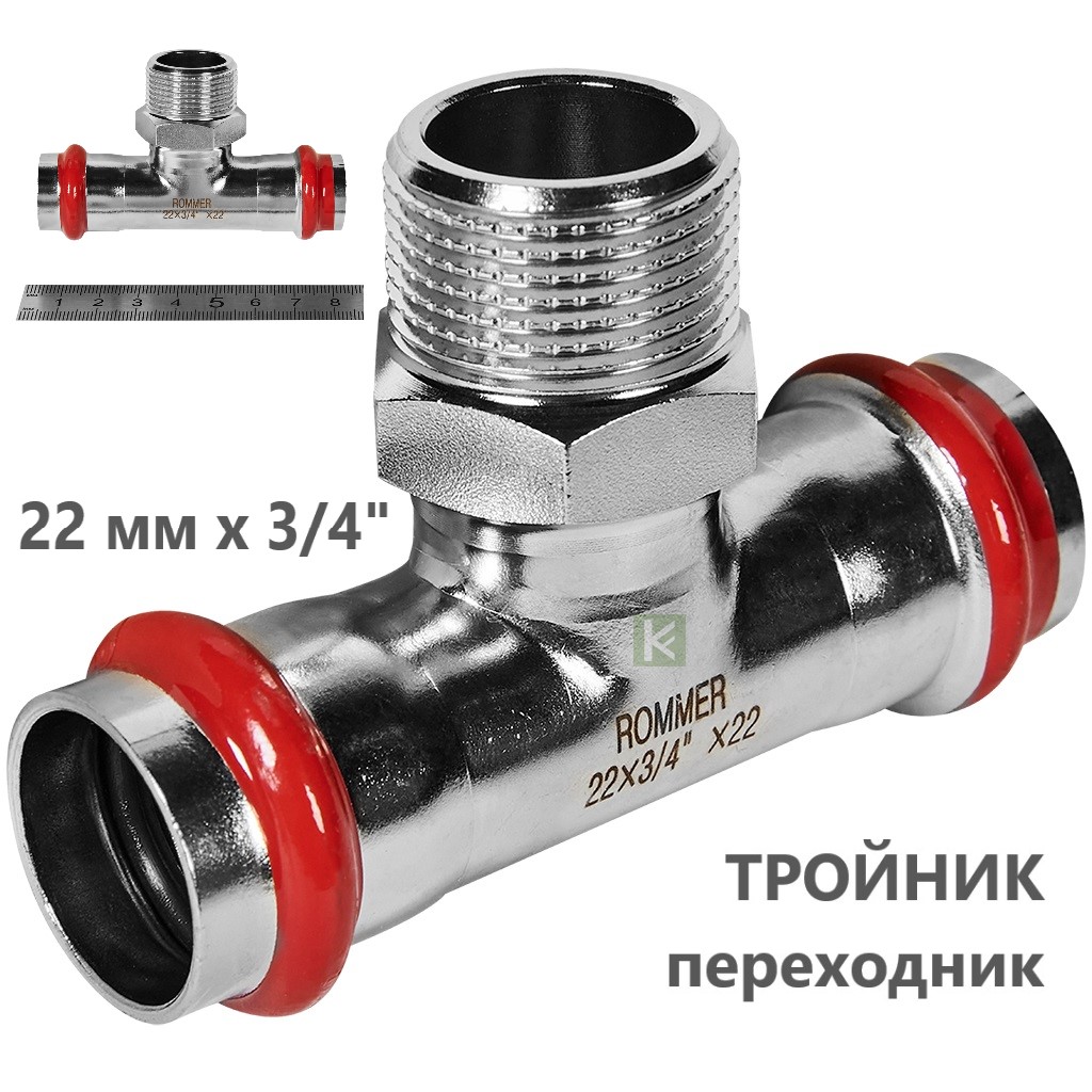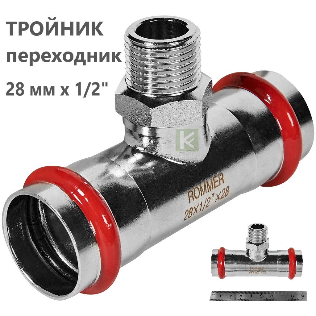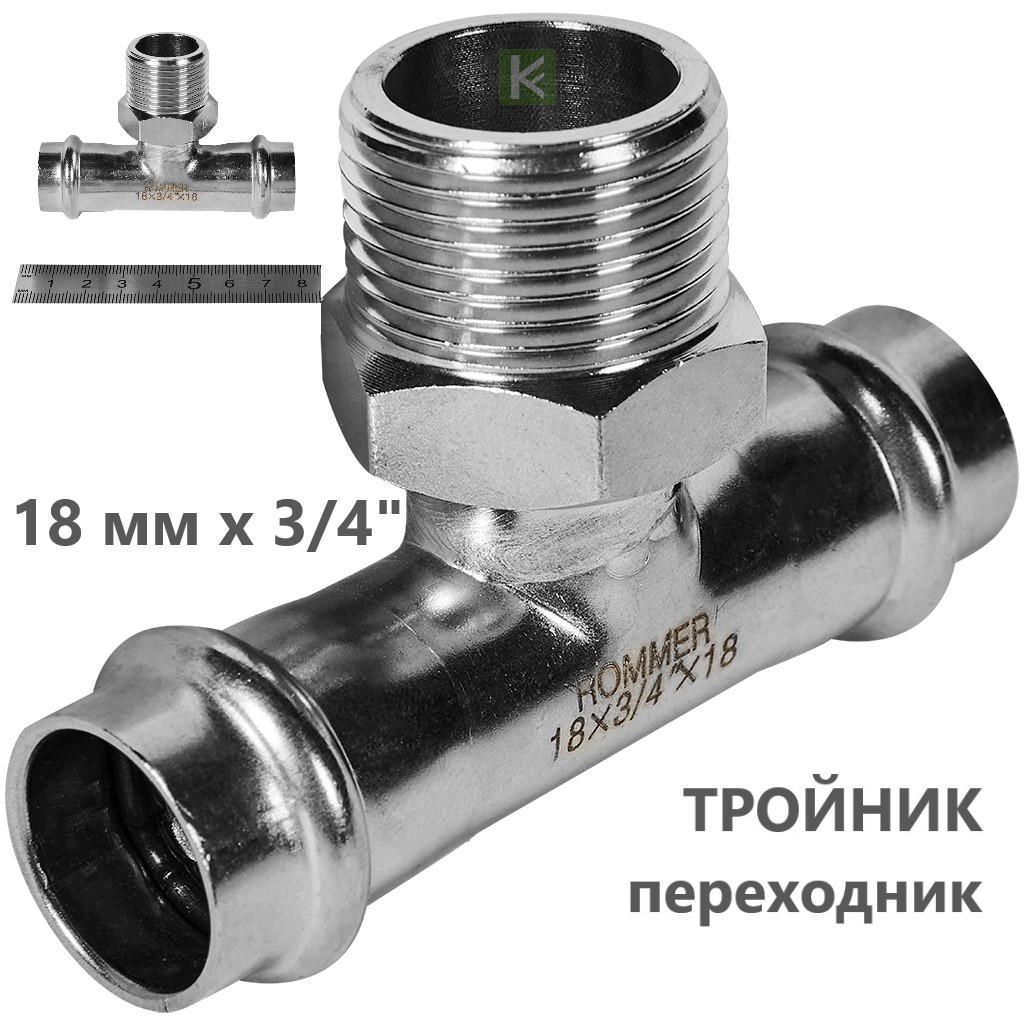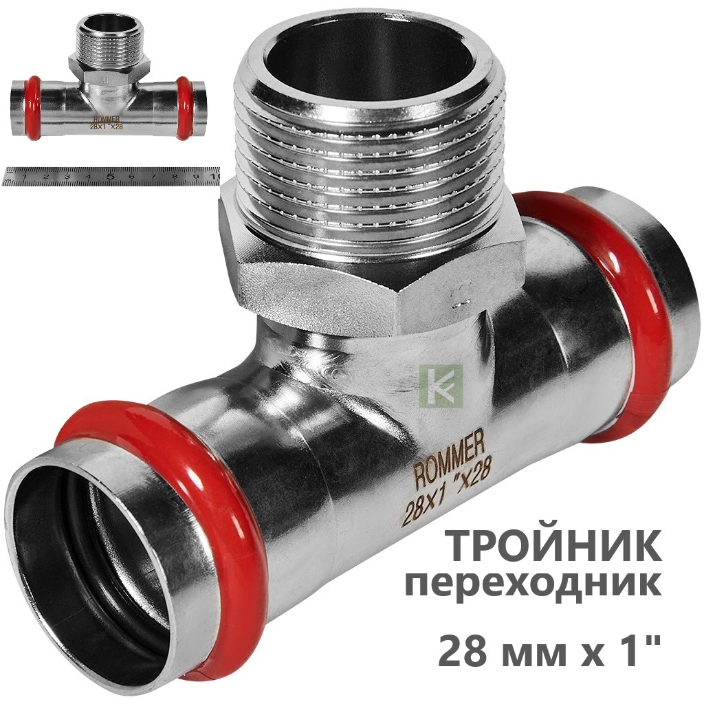 Пресс-тройники НР Rommer RSS-0016 из нержавеющей стали имеют раструбы по бокам, а в центре оборудованы наружной резьбой. Пресс-система ROMMER из нержавеющей стали - это высококачественное, устойчивое к коррозии, долговечное и надежное соединение пресс-фитингов и труб, изготовленных из гигиеничной нержавеющей стали SUS 304, способные выдерживать резкие перепады давления. Трубы и фитинги Роммер из нержавейки можно применять в системах с рабочим давлением до 16 атмосфер. Температура рабочей среды (при условии применения с уплотнителями из EPDM) может находиться в диапазоне от -35°C до +110°C. Опрессовка соединений труб и фитингов производится пресс-инструментом с насадками типа «V», имеющих трехточечный профиль обжима.