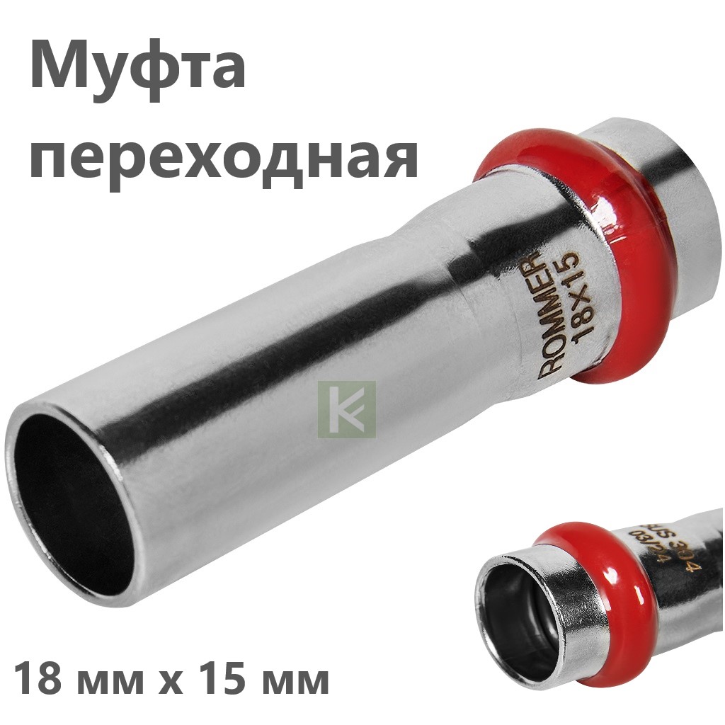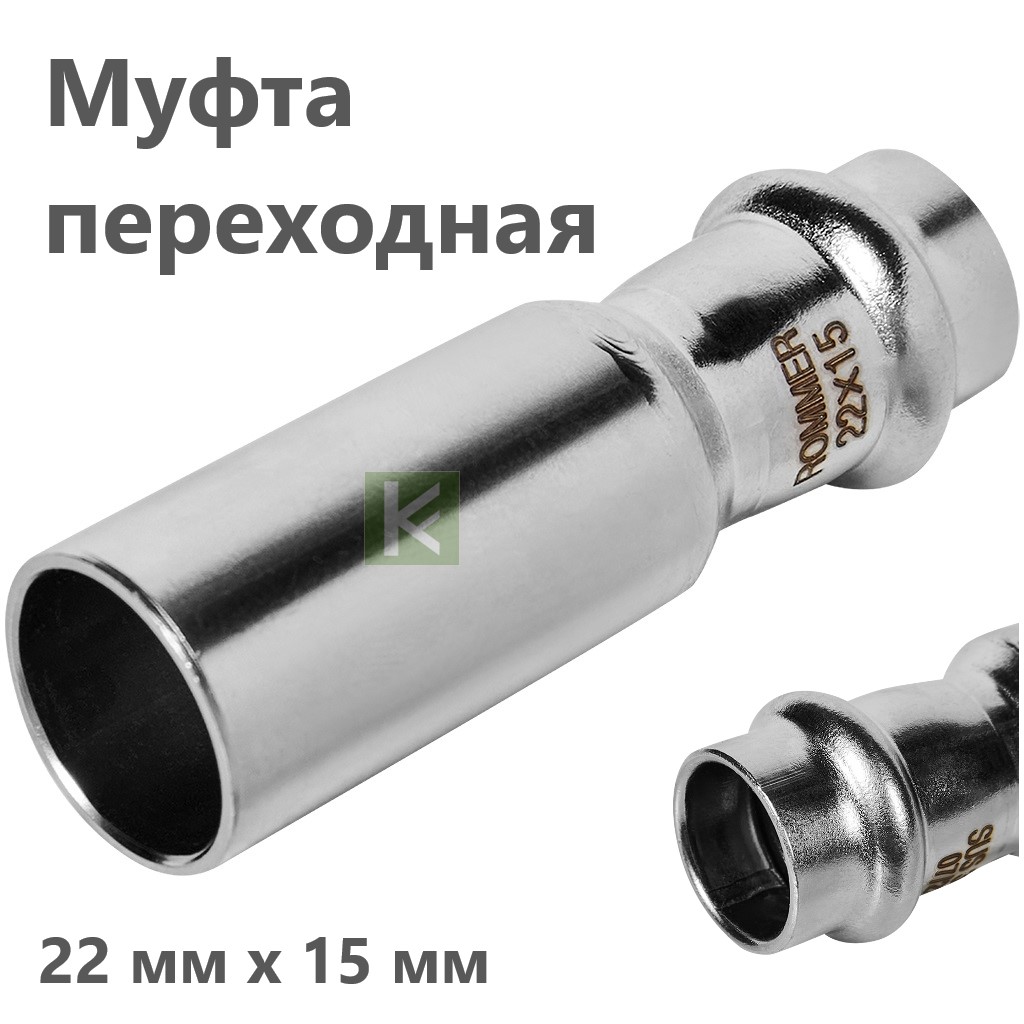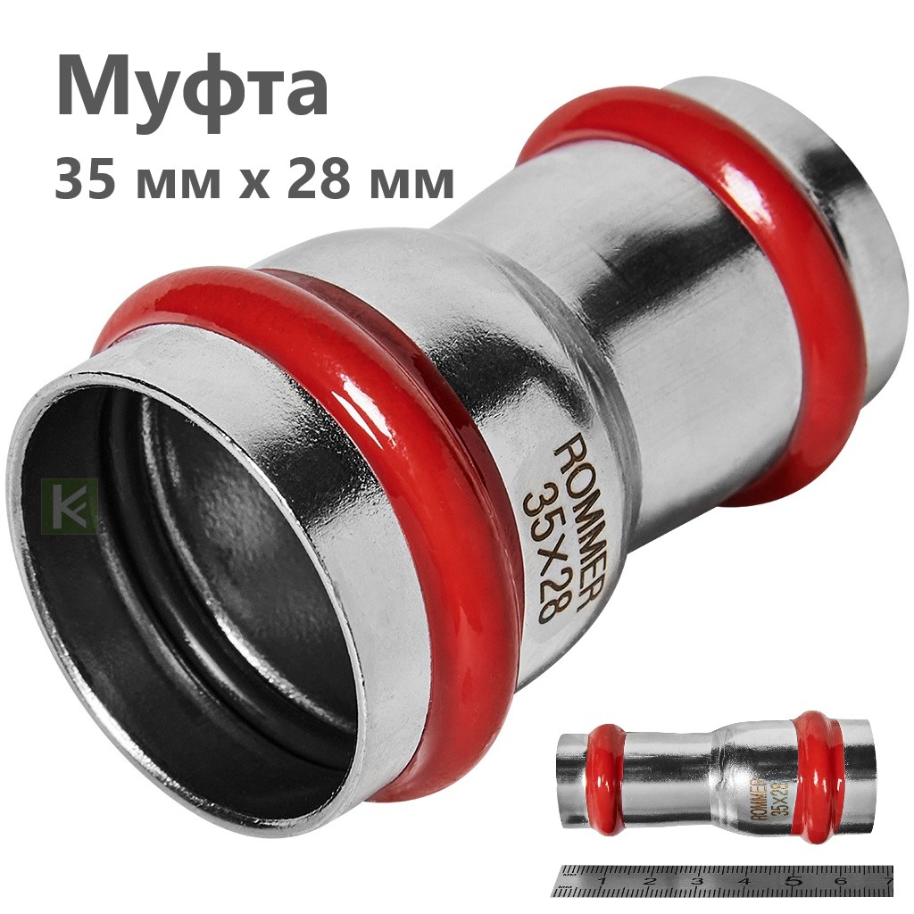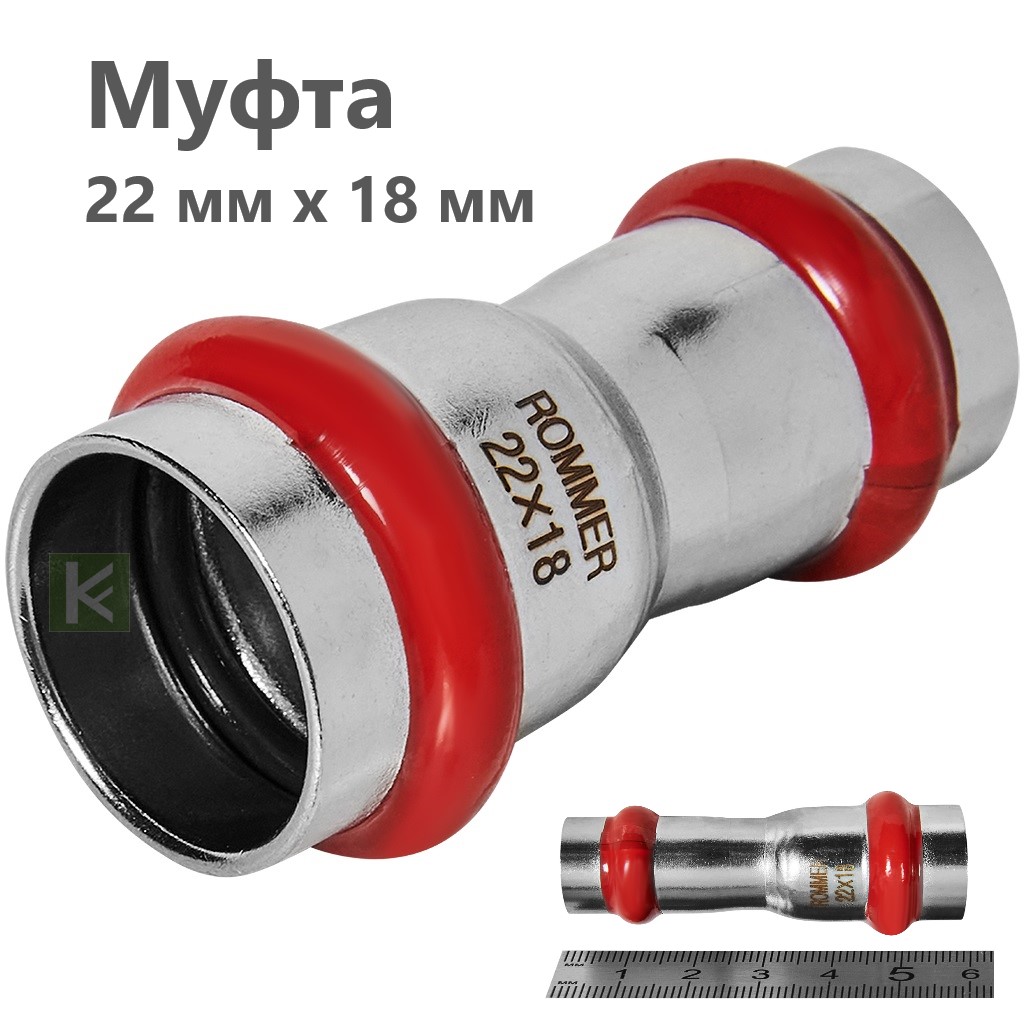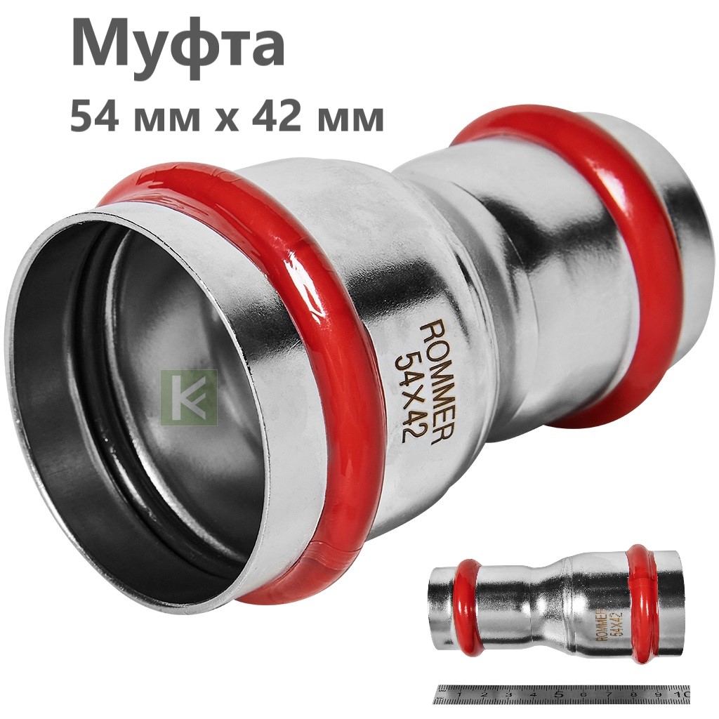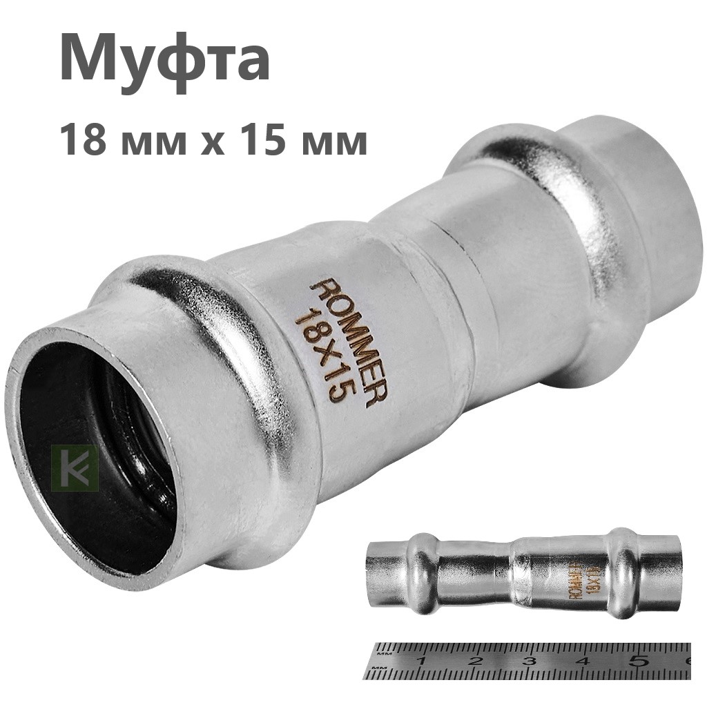 Равнопроходные пресс-муфты Rommer RSS-0017 из нержавеющей стали имеют раструбы с обеих сторон соединителя, а переходные муфты Rommer серии RSS-0018 снабжены раструбами разных диаметров с обеих сторон фитингов. Пресс-система ROMMER из нержавеющей стали - это высококачественное, устойчивое к коррозии, долговечное и надежное соединение пресс-фитингов и труб, изготовленных из гигиеничной нержавеющей стали SUS 304, способные выдерживать резкие перепады давления. Трубы и фитинги Роммер из нержавейки можно применять в системах с рабочим давлением до 16 атмосфер. Температура рабочей среды (при условии применения с уплотнителями из EPDM) может находиться в диапазоне от -35°C до +110°C. Опрессовка соединений труб и фитингов производится пресс-инструментом с насадками типа «V», имеющих трехточечный профиль обжима.