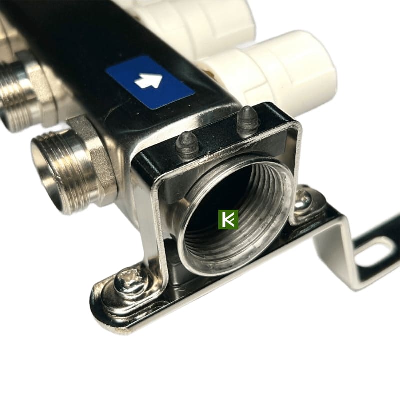 Отводы подающего и обратного трубопроводов – это ниппели с евроконусом и резьбой 3/4”. Коллекторы поставляются без концевых вентилей - они приобретаются отдельно.