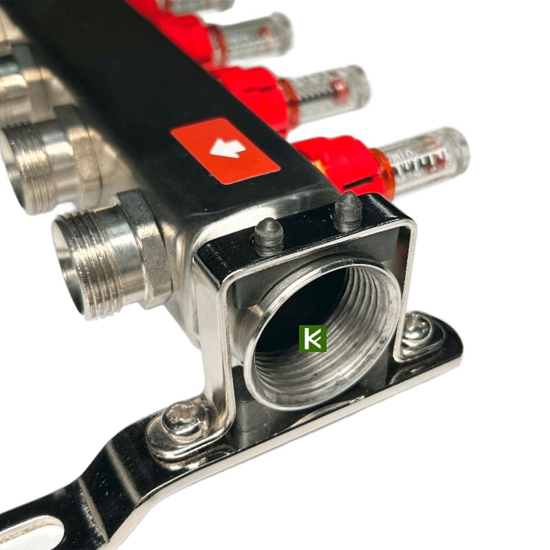 Каждый отвод обратного коллектора снабжён термостатическим вентилем, предназначенным для установки электрического привода или головок для ручной регулировки.