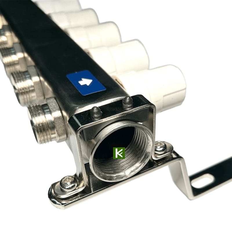 Отводы подающего и обратного трубопроводов – это ниппели с евроконусом и резьбой 3/4”. Коллекторы поставляются без концевых вентилей - они приобретаются отдельно.