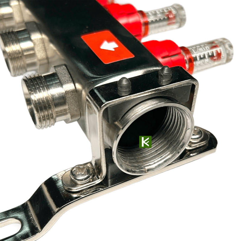 Каждый отвод обратного коллектора снабжён термостатическим вентилем, предназначенным для установки электрического привода или головок для ручной регулировки.